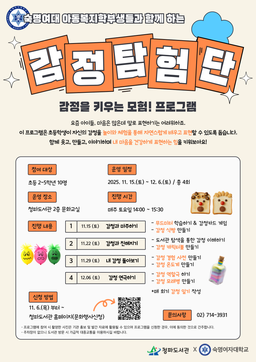 | 프로그램명 | 예정 [초2~5] 숙명여대 아동복지학부생들과 함께 하는 '감정 탐험단' |