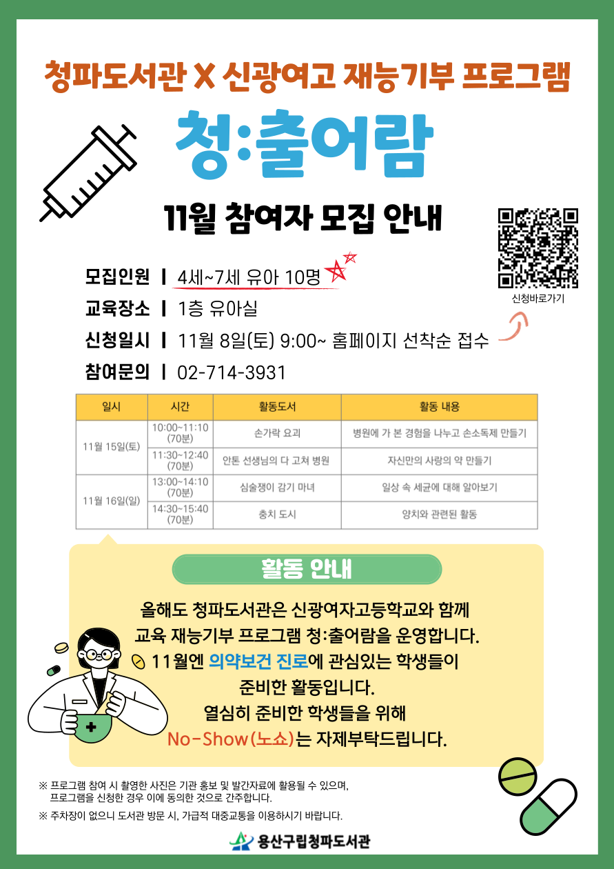 | 프로그램명 | 종료 [청:출어람_유아](11/16 14시 30분~) 양치와 관련된 활동 |