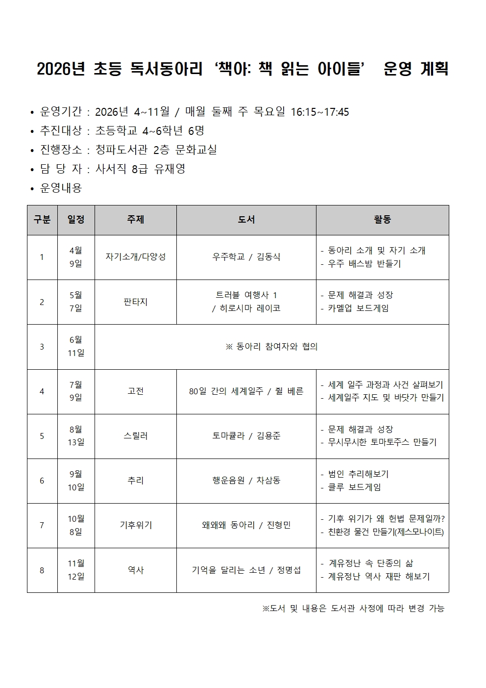 | 프로그램명 | 대기자접수 초등 4~6학년 독서동아리 <책아> 회원 모집 |