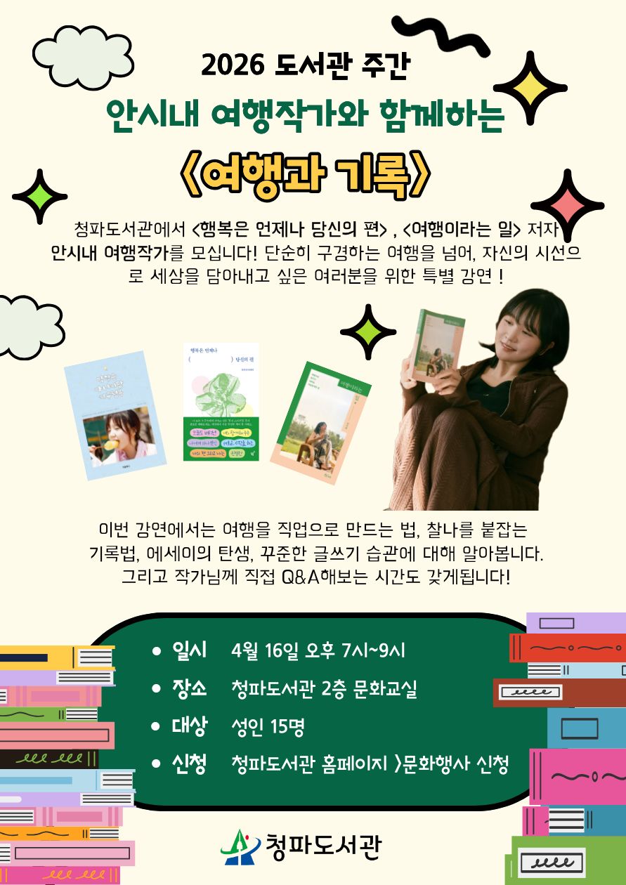 안녕하세요 청파도서관에서는 2026년 <도서관의 날. 도서관주간>을 맞이하여 다양한 행사를 준비하고 있습니다. 이번 도서관주간에서는 "여행"을 테마로하여 안시내 여행작가와 함께하는 <여행과 기록> 작가와의 만남 시간을 준비하였습니다. 관심있으신 분들께서는 신청해주시길 바랍니다 ^^!