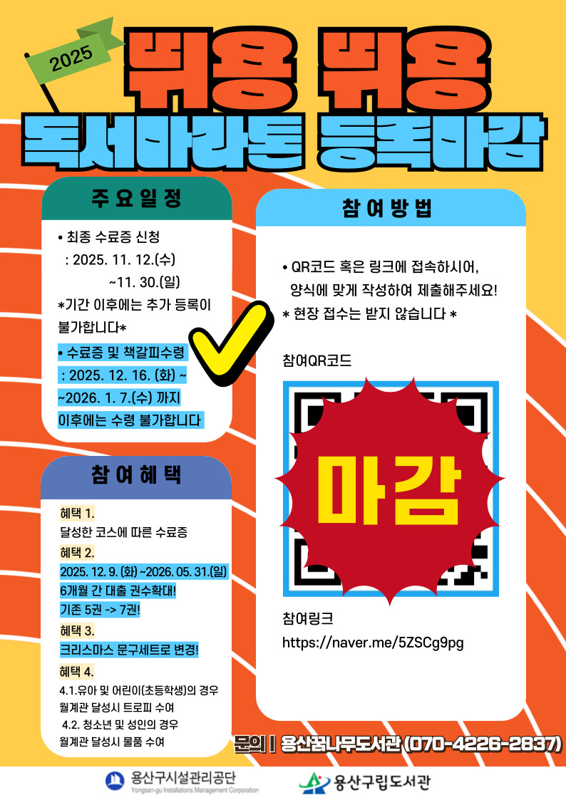 ![]() [뛰용뛰용 독서마라톤] 제 6회 뛰용뛰용 독서마라톤 마감 및 물품 수령 안내(12월 16일(화) - 26년 1월 7일(수)) 물품 수령일 및 혜택 물품이 변경되었음을 안내드립니다. 물품 수령일 : 25. 12.16.(화)~26. 1.7.(수) *해당 기간 외 수령이 불가합니다. 양해부탁드립니다.* *참여 혜택 혜택 1. 달성한 코스에 따른 수료증 혜택 2. 2025. 12. 09.(화) ~ 2026. 05. 31.(일) 6개월 간 대출 권수확대! 기존 5권 -> 7권! 혜택 3. 크리스마스 문구세트 혜택 4. 4.1. 유아 및 어린이(초등학생)의 경우 월계관 달성시 트로피 수여 4.2. 청소년 및 성인의 경우 월계관 달성시 물품 수여 *문의사항: 용산꿈나무도서관 (070-4226-2837) 올해 마라톤을 참여해주셔서, 대단히 감사드립니다. 내년에 새로운 2026 마라톤으로 찾아뵙겠습니다. 감사합니다. |
