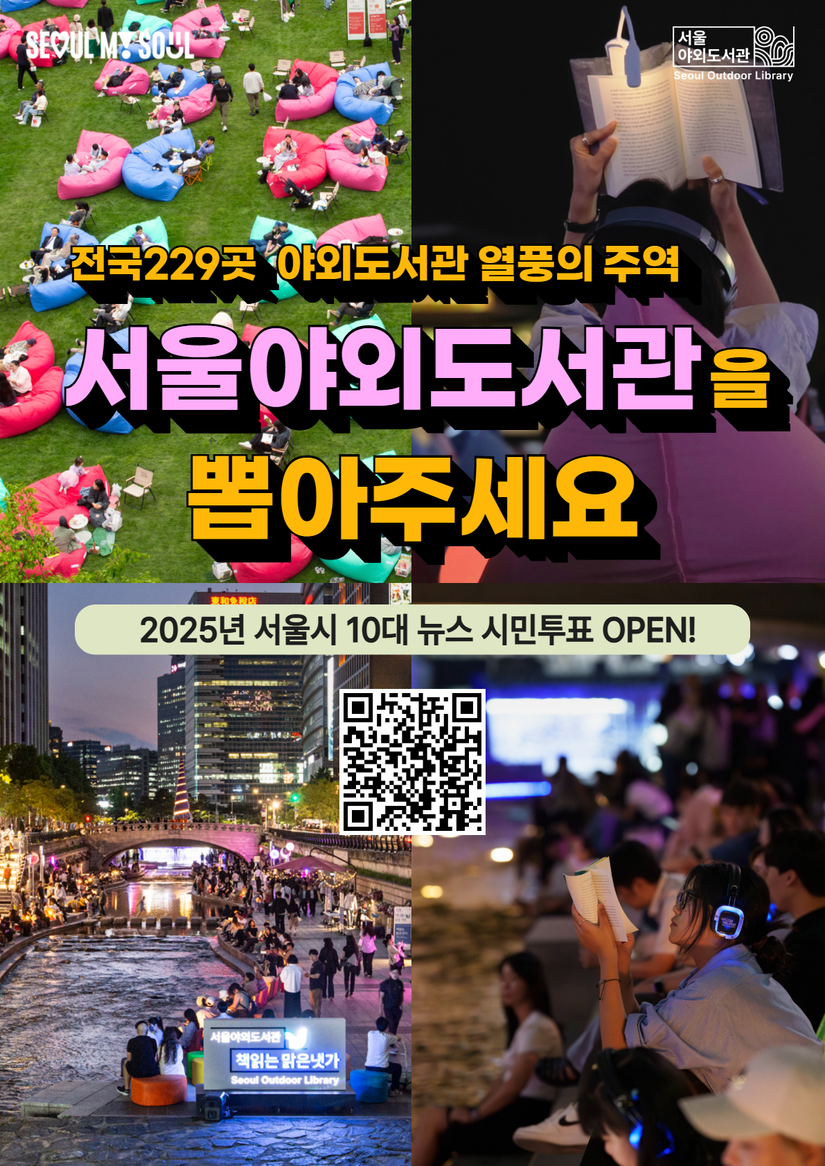 여러분! 올해의 서울야외도서관 어떠셨나요? 선선한 가을 날씨 아래 밖에서 친구 혹은 가족, 연인과 함께 책 읽는 시간을 보낼 수 있어서 너무 좋지 않았나요? 그 마음을 담아, 올해 서울야외도서관에 투표해주세요! 내년에도~ 서울 야외도서관은 계속 됩니다. 많은 관심과 참여 부탁드립니다. - 참여 기간 : 2025. 12. 8. (월) 00:00 ~ 12. 19.(금) 23:59