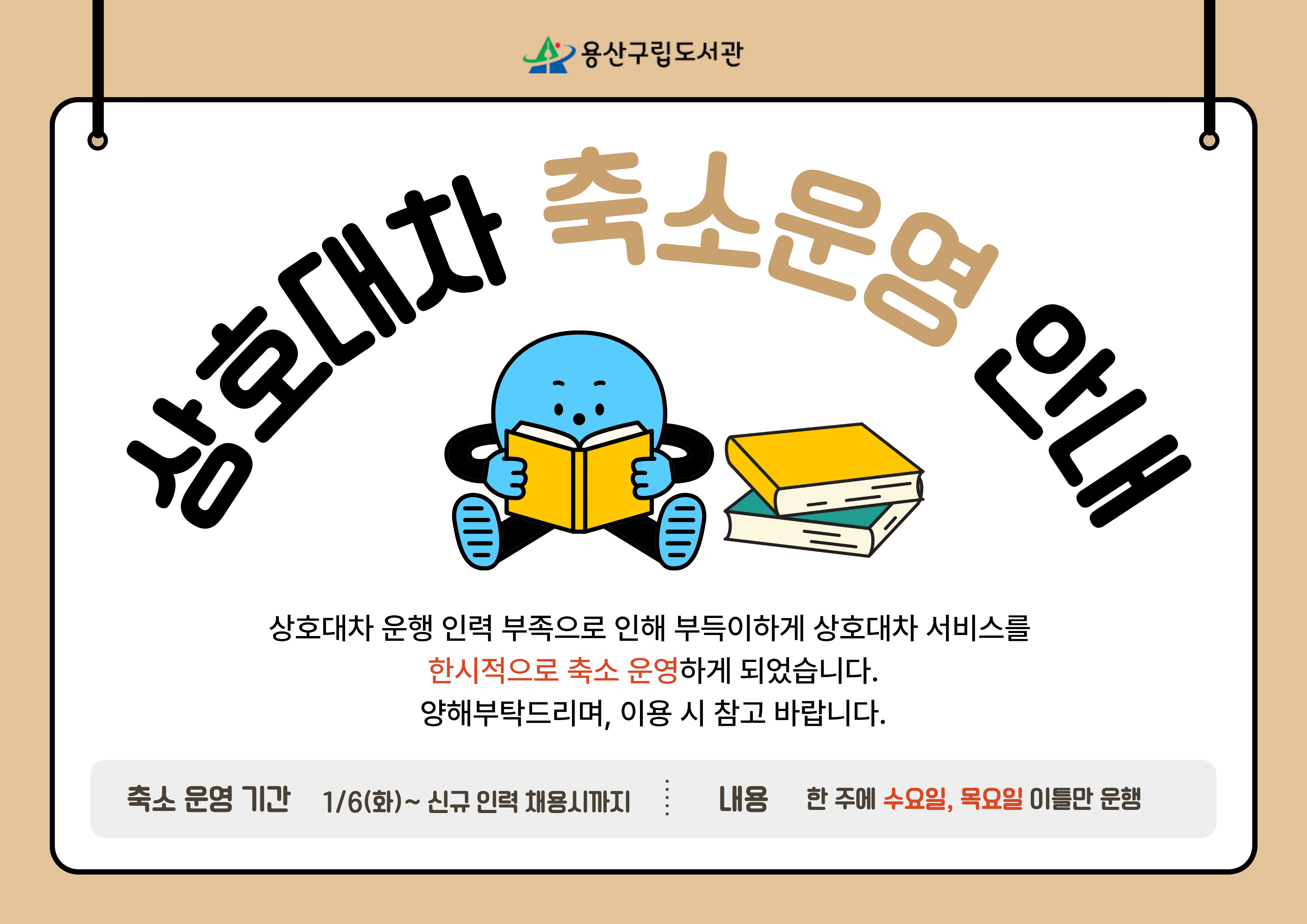 용산구립도서관 상호대차서비스 축소 운영 안내(1/6 부터~)