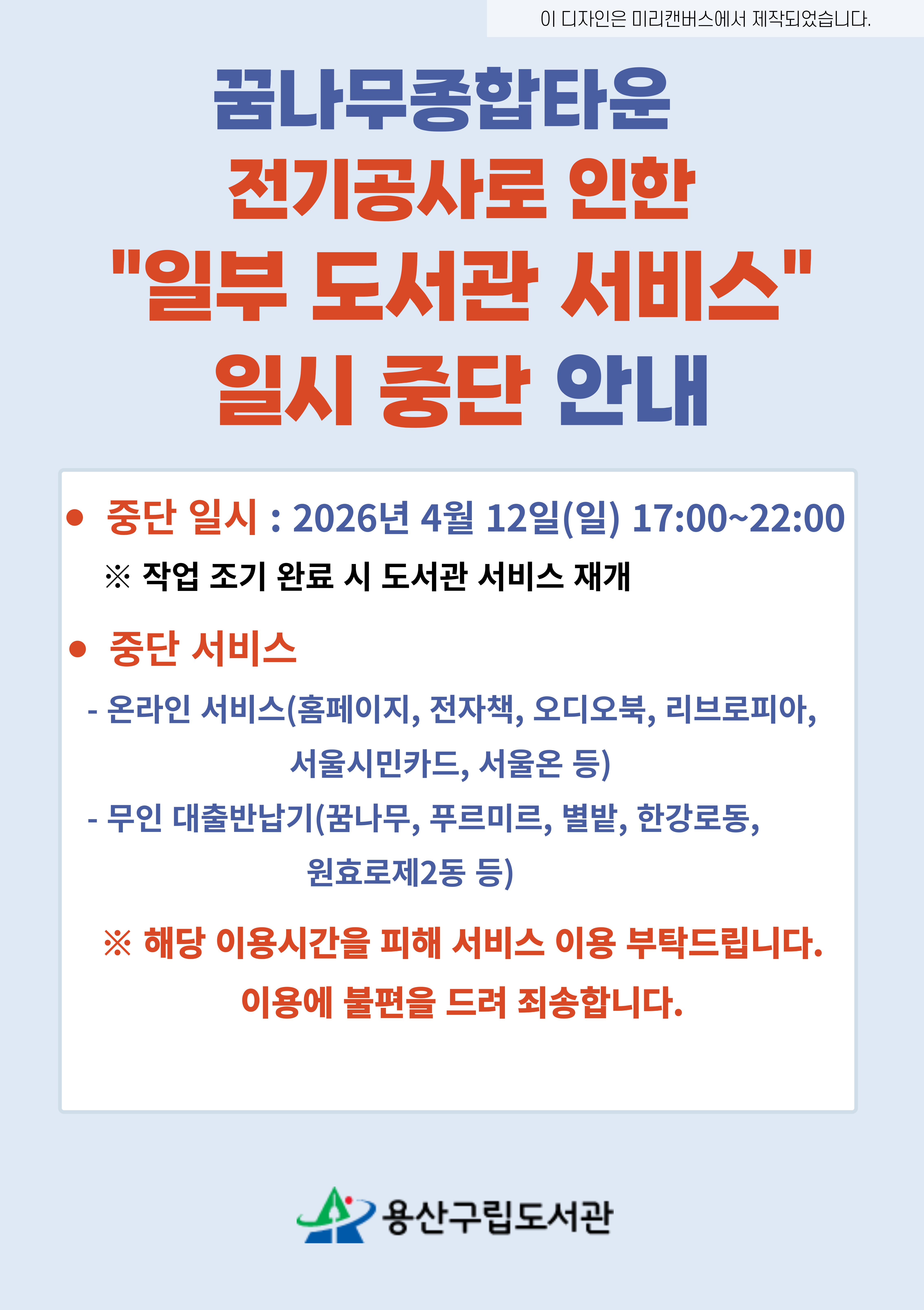 정전으로 인한 도서관 서비스 일시 중단(2026년 4월 12일(일) 17:00~22:00)
