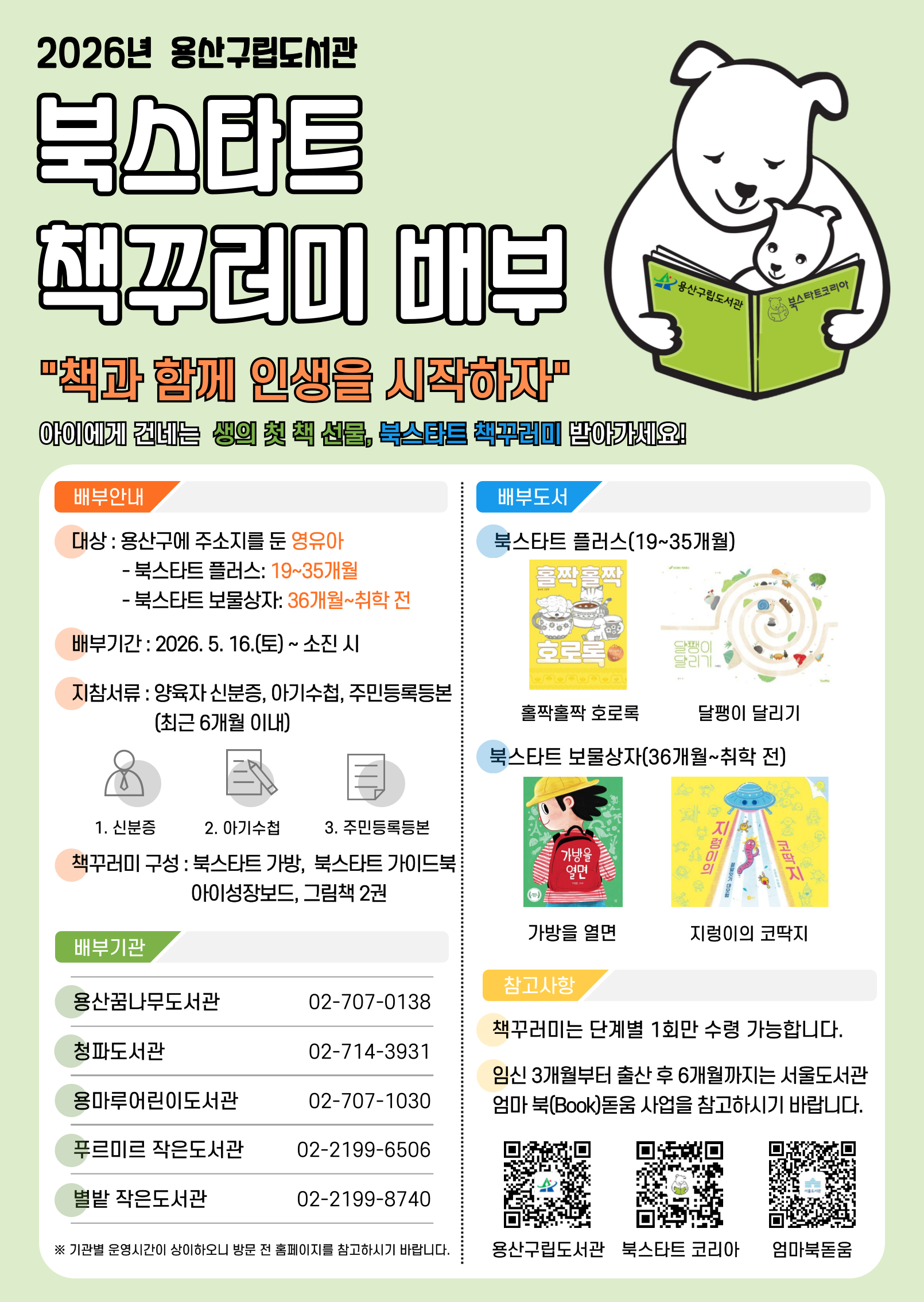 안녕하세요 용산꿈나무도서관입니다. 2026년 용산구립도서관 북스타트 책꾸러미 배부가 5/16(토) 부터 시작됩니다! 용산구에 거주하는 영유아(19개월~ 취학 전)들을 대상으로 배부하오니 해당하시는 분들은 서류 지참하시어 도서관으로 방문해 주시기 바랍니다. 감사합니다. 지참서류: 등본(최근 6개월 내 발급), 신분증, 아기수첩 ◆ 플러스 단계(19~35개월) 도서: 홀짝홀짝 호로록, 달팽이 달리기 ◆ 보물상자 단계(36개월~취학전) 도서: 가방을 열면, 지렁이의 코딱지 ◇ 수령처 - 용산꿈나무도서관(02-707-0138) - 청파도서관(02-714-3931) - 용마루어린이도서관(02-707-1030) - 푸르미르작은도서관(02-2199-6506) - 별밭작은도서관(02-2199-8740) ※ 각 도서관별 운영 시간 및 수량이 상이하므로 방문 전 확인 부탁드립니다. 용산구립통합도서관: https://www.yslibrary.or.kr/intro/index.do