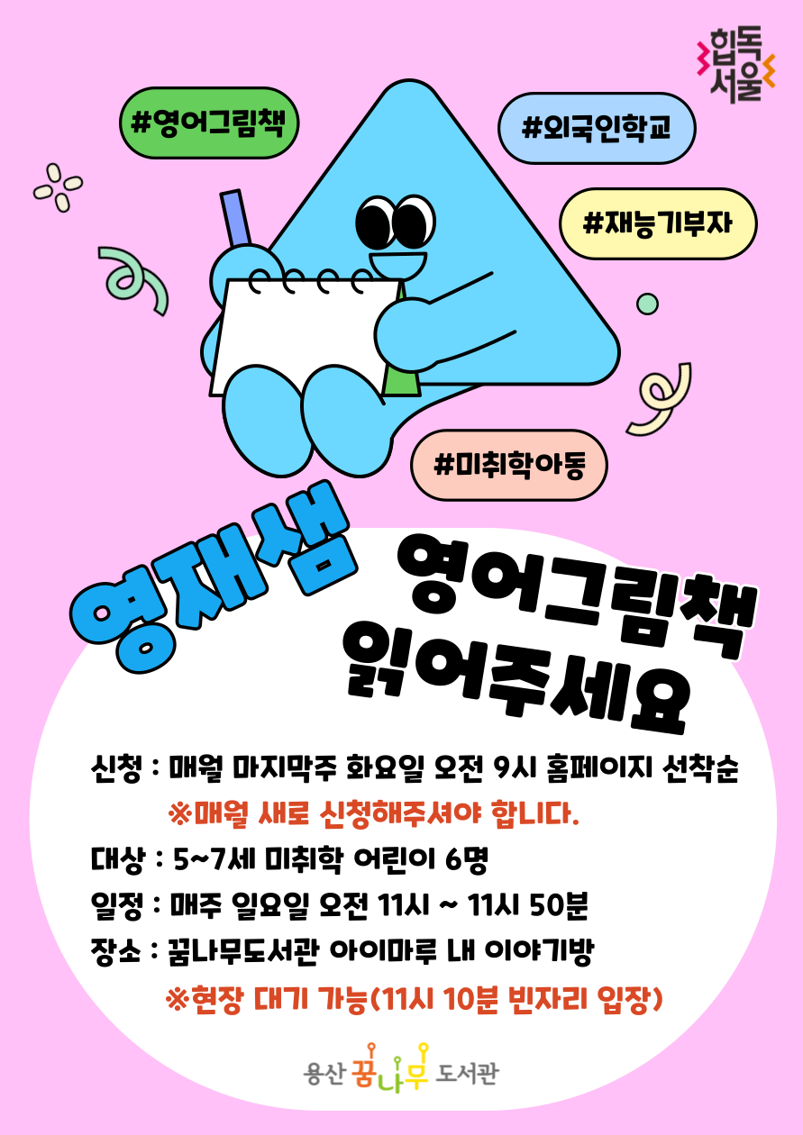 6월 1일은 휴강입니다 일 결석인원 발생 시 현장 참여 희망자 10분 대기 후 입실 가능합니다. 대출반납데스크에서 대기명단을 작성해주세요. 외국인학교 재학 중인 청소년 영어 재능기부자가 진행합니다. 보호자 없이 어린이만 참여합니다. 모집은 매월 마지막주 화요일에 다음달 수업 신청 가능합니다.(월단위) 11시 10분부터는 현장 대기자가 입실하므로 참여가 불가합니다.