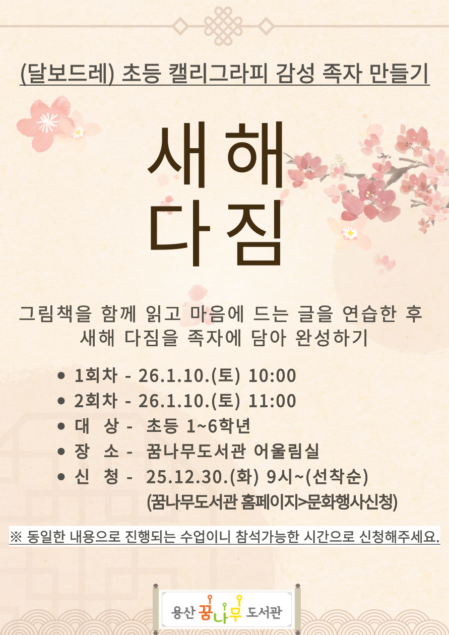 | 프로그램명 | 접수마감 (달보드레) 초등 캘리그라피 「감성 족자 만들기_새해 다짐」 [1회차 10시] |