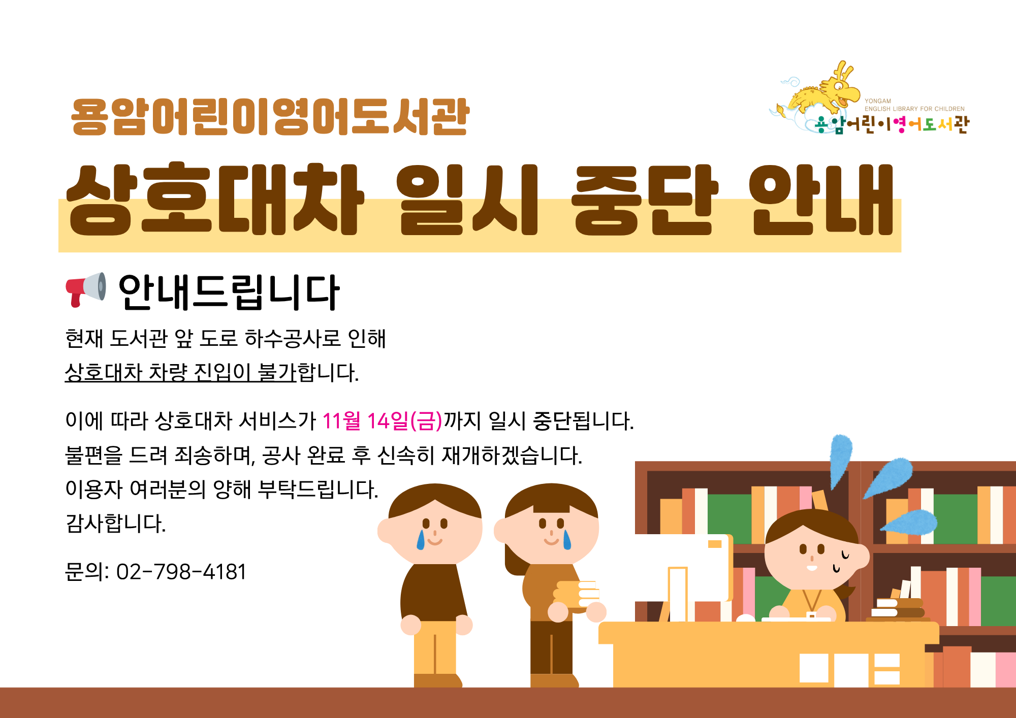 📢 안내드립니다 현재 도서관 앞 도로 하수 공사로 인해 이에 따라 상호대차 서비스가 11월 14일(금)까지 일시 중단됩니다. 이용자 여러분의 양해 부탁드립니다. |