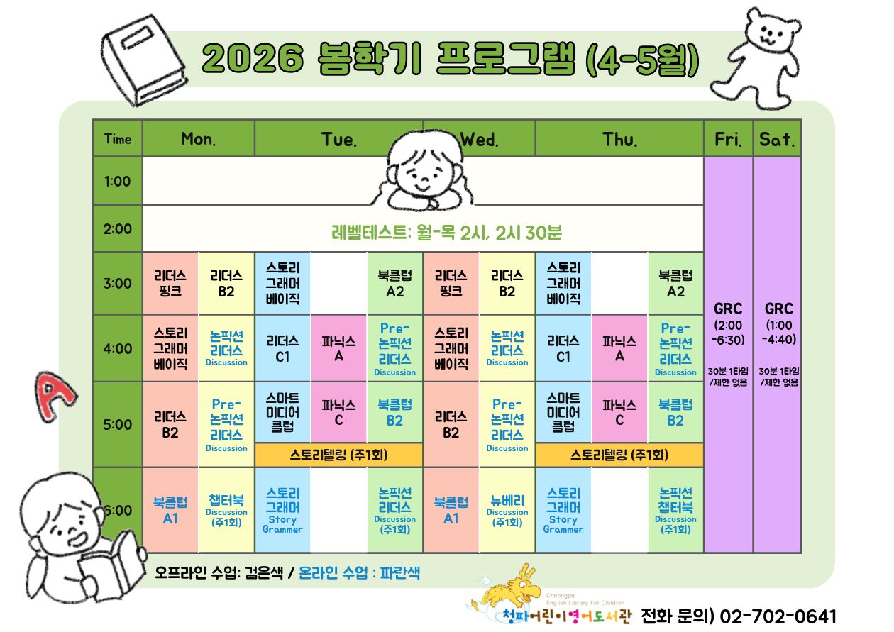 청파어린이영어도서관 2026 봄학기(4-5월) 프로그램 시간표