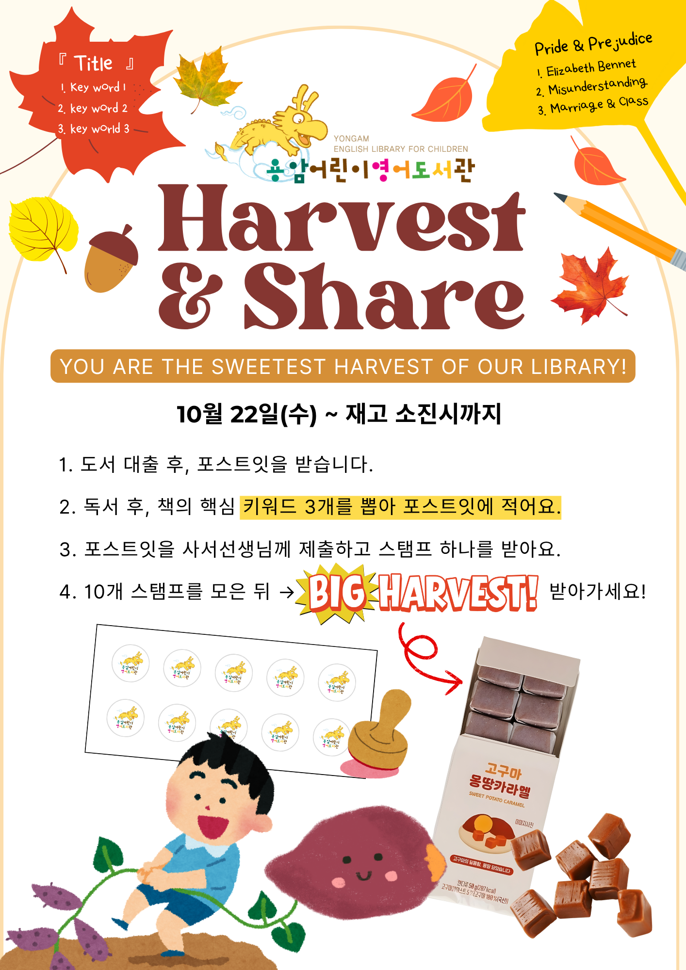 🍂 Harvest & Share — YOU ARE THE SWEETEST HARVEST OF OUR LIBRARY! 🍂 가을의 풍성한 수확처럼, 책으로 마음의 열매를 함께 나누는 독서 이벤트가 열립니다! 📅 기간: 10월 22일(수) ~ 재고 소진 시까지 참여 방법 📚 도서관과 함께 따뜻한 가을을 수확해요. |