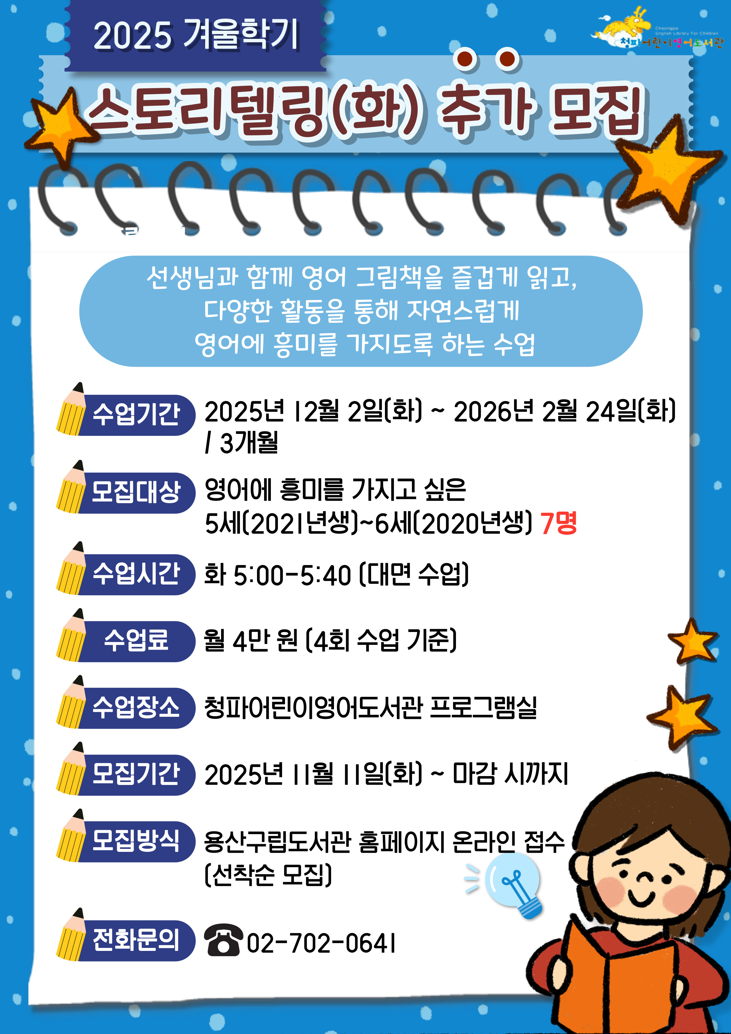 ✔ 11/11(화) 오전 10시부터 프로그램 신청이 가능합니다. ✔ 신청 시 학생 이름 옆에 2025년 나이를 함께 적어주세요. (도서관 회원 1인당 1인 신청) ✔ 수업의 모집 요건을 잘 확인하고 신청해주세요. ✔ '스토리텔링' 프로그램은 레벨테스트 없이 신청만으로 시작 가능한 수업입니다. ✔ 프로그램 신청과 결제는 11월에 진행되며, 수업은 12월부터 시작됩니다.