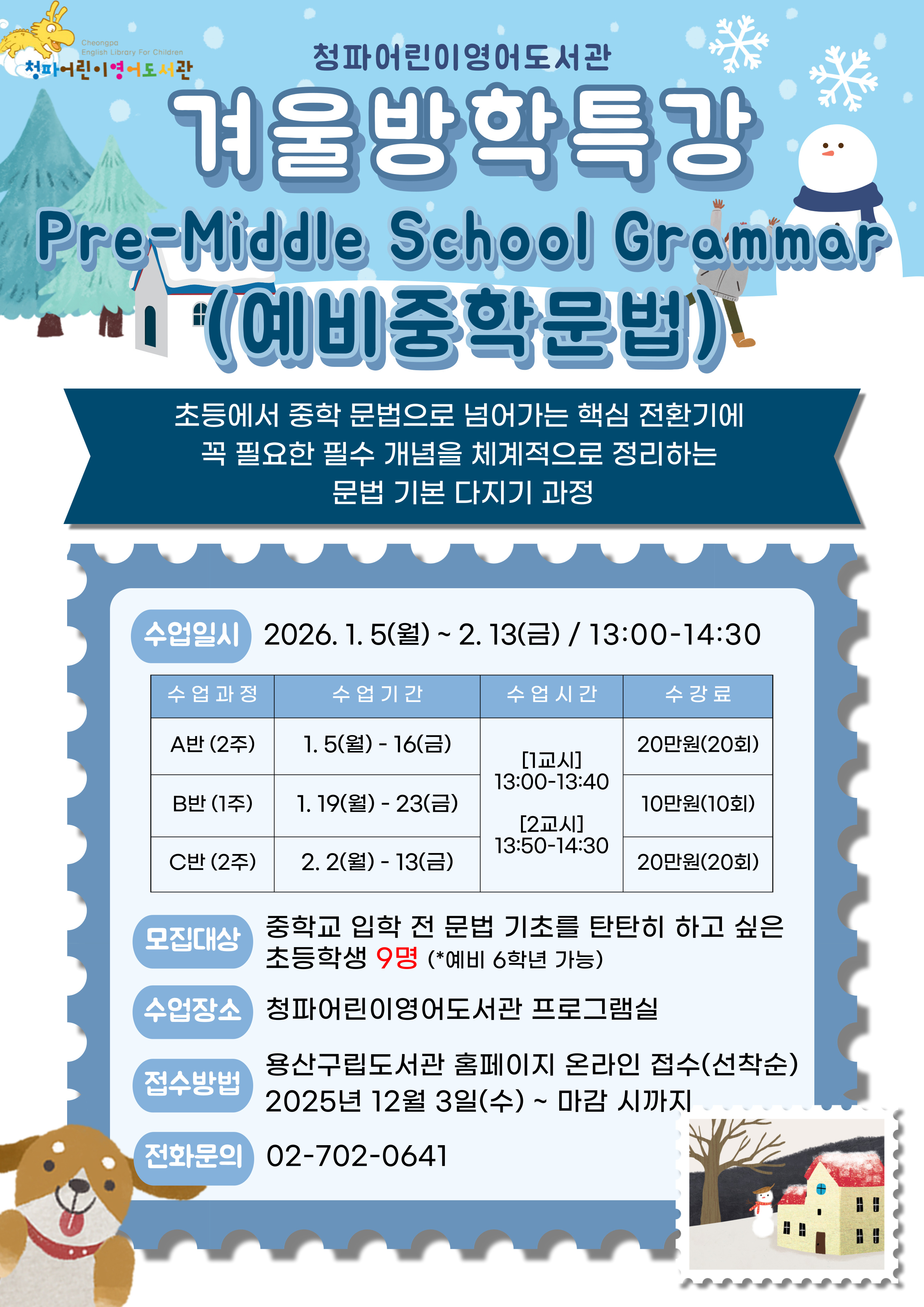 | 프로그램명 | 접수중 2026년 겨울방학특강 <Pre-Middle School Grammar> B반 모집 |