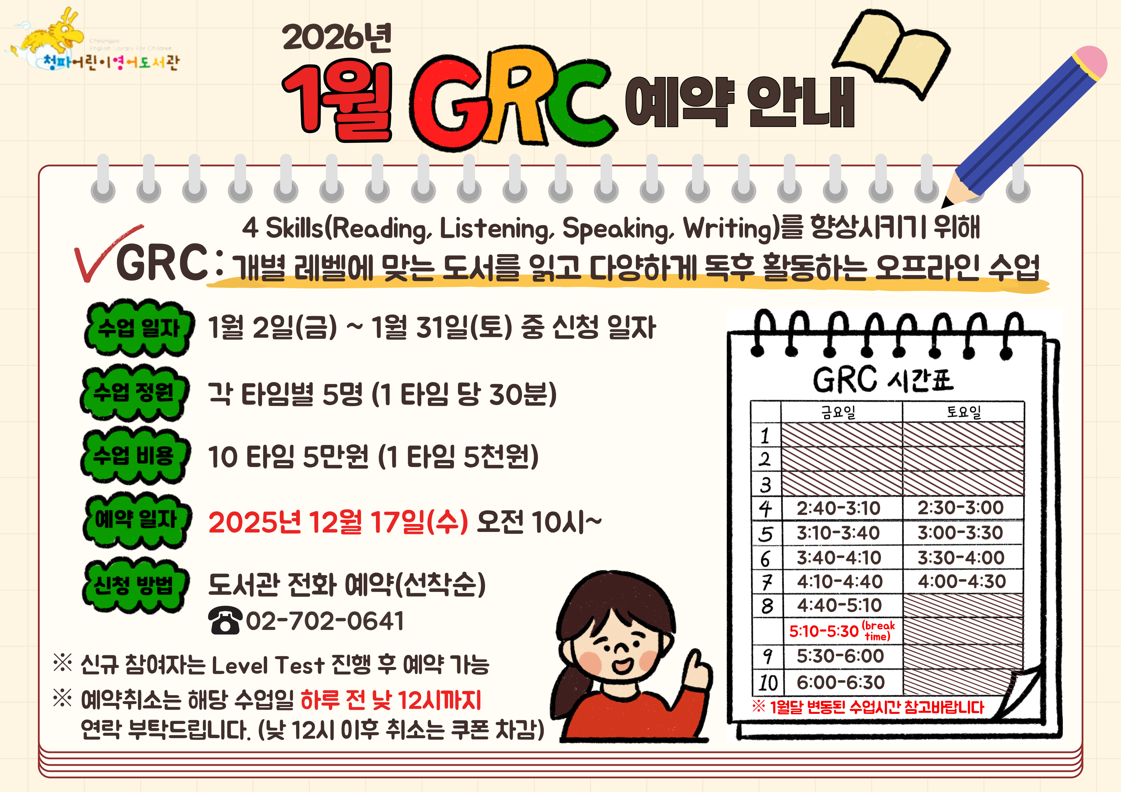 ✔ 신청은 오늘(2025.12.17.수)부터 가능합니다. ✔ 도서관(02-702-0641)으로 전화 주시면 예약하실 수 있습니다. ✔ 공지사항 속 GRC 시간표를 꼭 확인해주세요. ✔ 예약 취소는 해당 수업일 하루 전 낮 12시까지 연락주세요. 전날 낮 12시 이후 취소는 쿠폰이 차감됩니다. ✔ GRC 10회 쿠폰 유효기간은 수업 첫날로부터 3개월입니다. ※ 주차공간이 협소하오니 도서관 방문 시, 가급적 대중교통을 이용하시기 바랍니다.