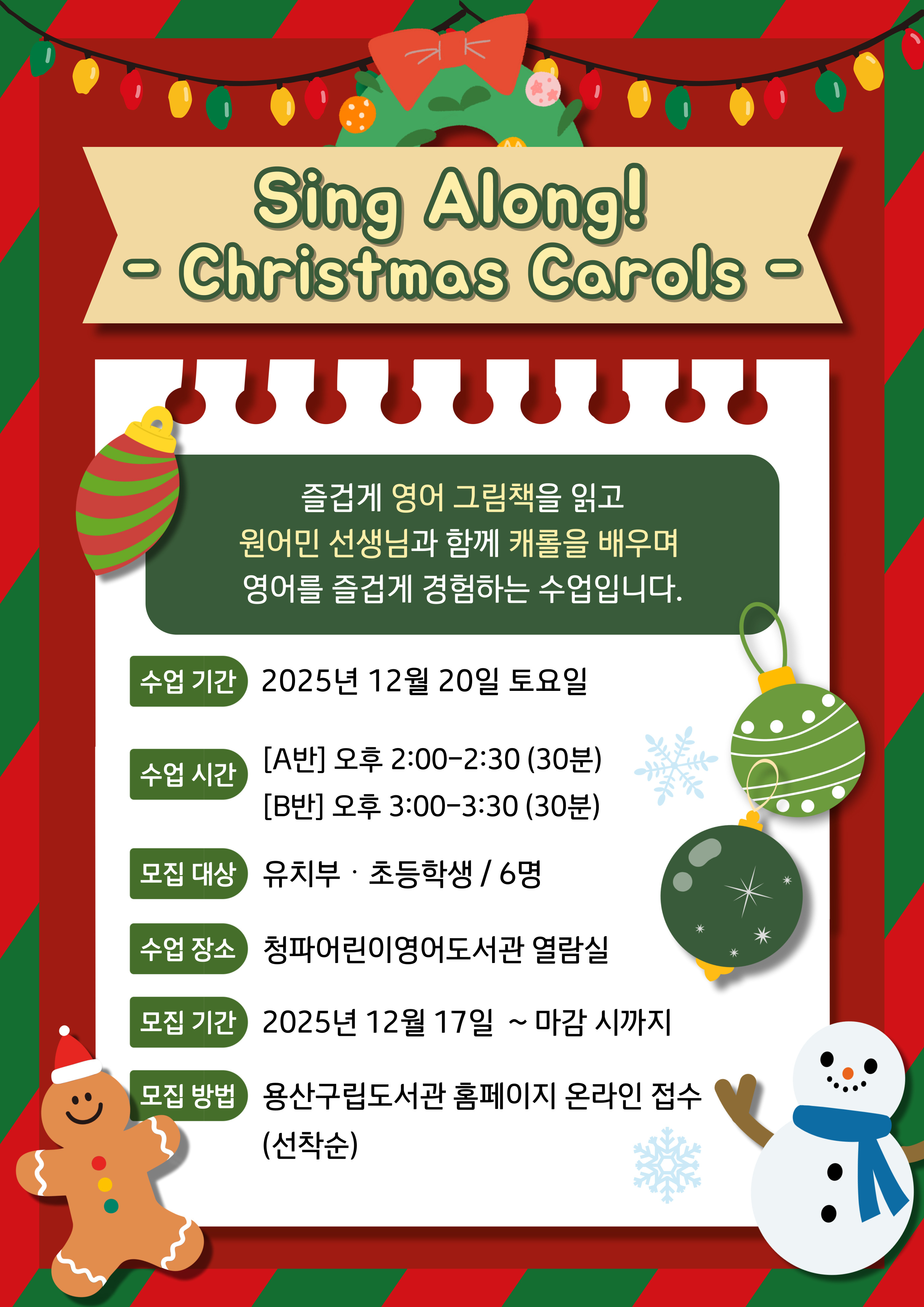 | 프로그램명 | 접수마감 12월 크리스마스 문화프로그램 <Sing Along!-Christmas Carols> A반 수업 모집 |