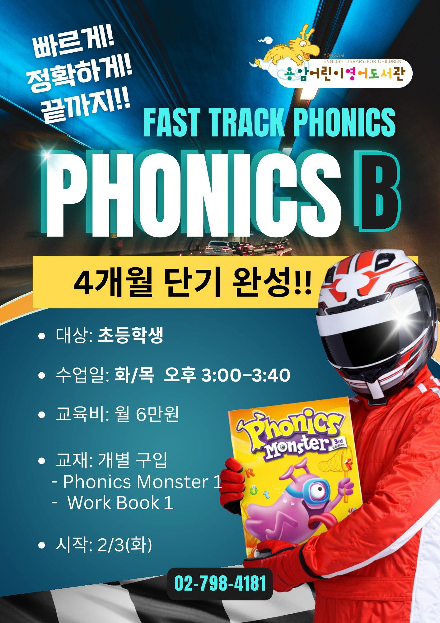 ![]() 빠르게! 정확하게! 끝까지! 파닉스를 “제대로” 잡고 싶은 친구들을 위한 화/목 속성 파닉스 과정입니다. 4개월 단기 완성 코스로, 핵심 규칙을 빠르게 정리하고 읽기 자신감을 탄탄하게 만들어보아요! 도서관 회원 1당 1인 신청임을 안내드립니다. 두자녀의 경우 각각 따로 신청이 필요합니다. ※ 모집 인원 마감 후, 등록 안내예정. |