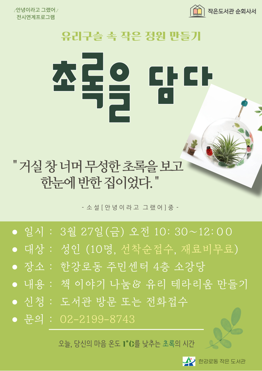 | 프로그램명 | 접수마감 [성인 프로그램] 작은 정원 만들기 + 초록을 담다 |