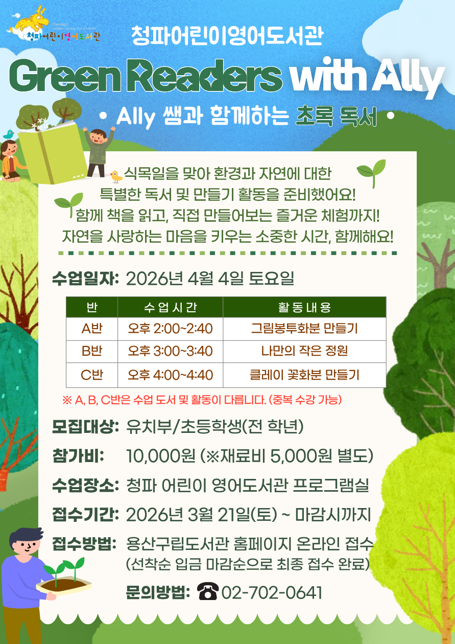 | 프로그램명 | 접수중 [4월 식목일 원어민 특강] Green Readers with Ally B반 (오후 3:00-3:40) |