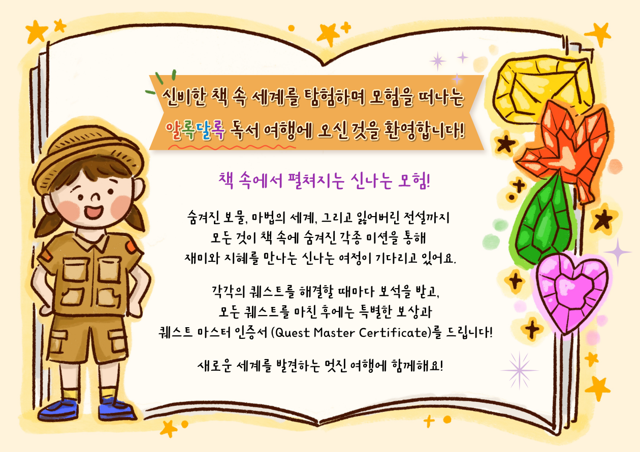 ✔ 현재 프로그램 모집 신청 중입니다. ✔ 신청 시 학생 이름 옆에 2026년 나이를 함께 적어주세요. (도서관 회원 1인당 1인 신청) ✔ 최종 참여자에게 참가비 결제 안내 문자가 발송됩니다. 문자를 수신 후 등록을 완료하시고 수업에 참여해주세요. ✔ 앞 신청자가 취소하실 경우 대기자에게 연락드립니다. ※ 프로그램 참여 시 촬영한 사진은 기관 홍보 등에 활용될 수 있으며, 프로그램을 신청한 경우 이에 동의한 것으로 간주합니다.※ 주차공간이 협소하오니 도서관 방문 시, 가급적 대중교통을 이용하시기 바랍니다. 🌈 알록달록 독서여행 특강 안내 매달 토요일, 청파어린이영어도서관에서는 색색의 테마를 따라 떠나는 "알록달록 독서여행 특강"이 열리고 있어요! 특강에 참여한 친구들에게는 매번 특별한 퀘스트가 주어져요! 미션을 멋지게 수행하면 보석 아이템✨을 획득할 수 있으며, 퀘스트를 모두 완료한 친구에겐 '퀘스트 마스터 인증서와 깜짝 선물'을 드립니다. 이번 특강을 신청한 학생들을 대상으로 퀘스트를 가장 멋지게 완수한 탐험가가 선정될 예정이니 많은 관심과 참여 부탁드립니다 :) ![]()