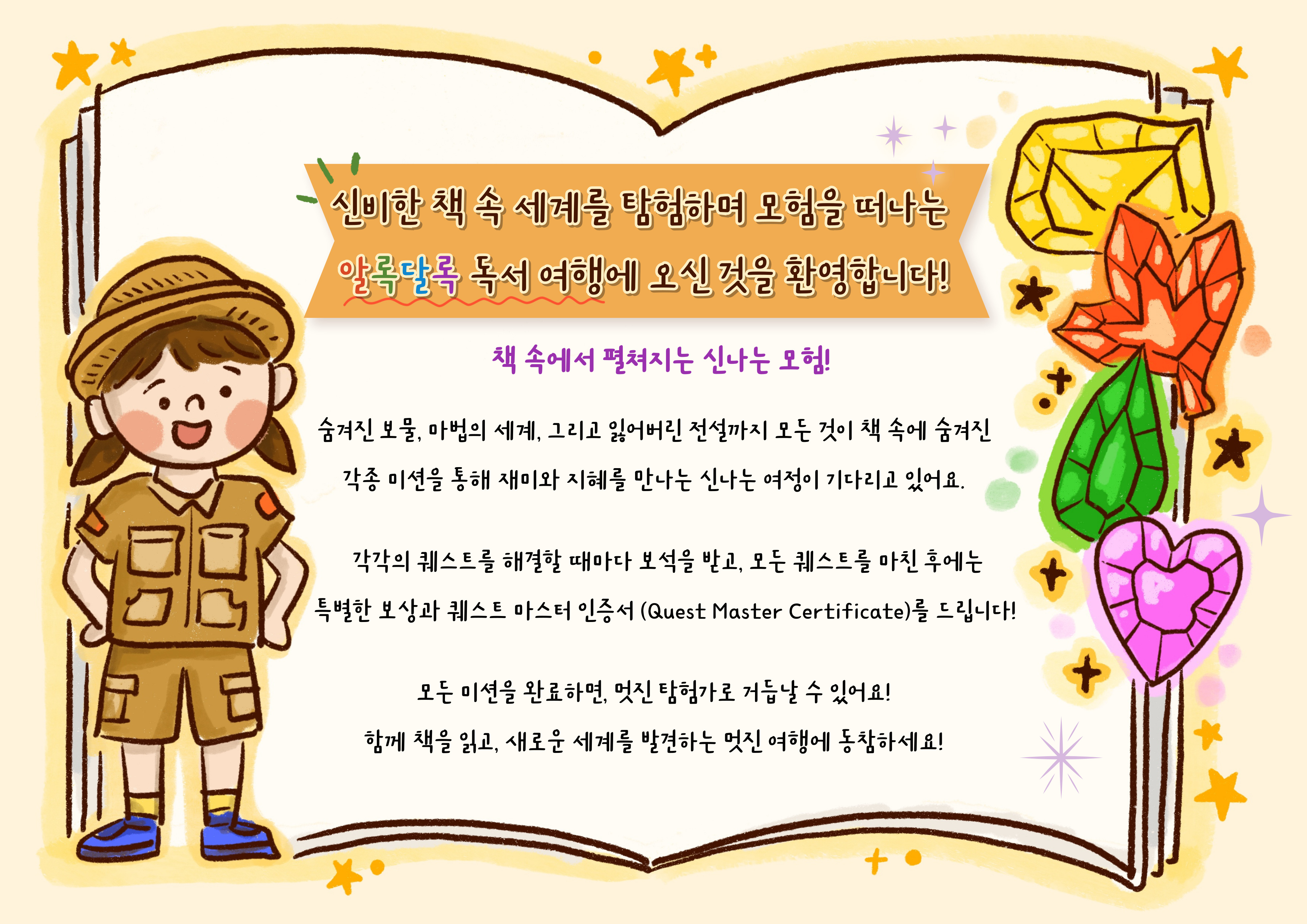 ✔ 현재 프로그램 모집 신청 중입니다. ✔ 신청 시 학생 이름 옆에 2026년 나이를 함께 적어주세요. (도서관 회원 1인당 1인 신청) ✔ 최종 참여자에게 참가비 결제 안내 문자가 발송됩니다. 문자를 수신 후 등록을 완료하시고 수업에 참여해주세요. ✔ 앞 신청자가 취소하실 경우 대기자에게 연락드립니다. ![]() ※ 프로그램 참여 시 촬영한 사진은 기관 홍보 등에 활용될 수 있으며, 프로그램을 신청한 경우 이에 동의한 것으로 간주합니다. ※ 주차공간이 협소하오니 도서관 방문 시, 가급적 대중교통을 이용하시기 바랍니다. 🌈 알록달록 독서여행 특강 안내 매달 토요일, 청파어린이영어도서관에서는 색색의 테마를 따라 떠나는 "알록달록 독서여행 특강"이 열리고 있어요! 특강에 참여한 친구들에게는 매번 특별한 퀘스트가 주어져요! 미션을 멋지게 수행하면 보석 아이템✨을 획득할 수 있으며, 퀘스트를 모두 완료한 친구에겐 '퀘스트 마스터 인증서와 깜짝 선물'을 드립니다. 이번 특강을 신청한 학생들을 대상으로 퀘스트를 가장 멋지게 완수한 탐험가가 선정될 예정이니 많은 관심과 참여 부탁드립니다 :) ![]()