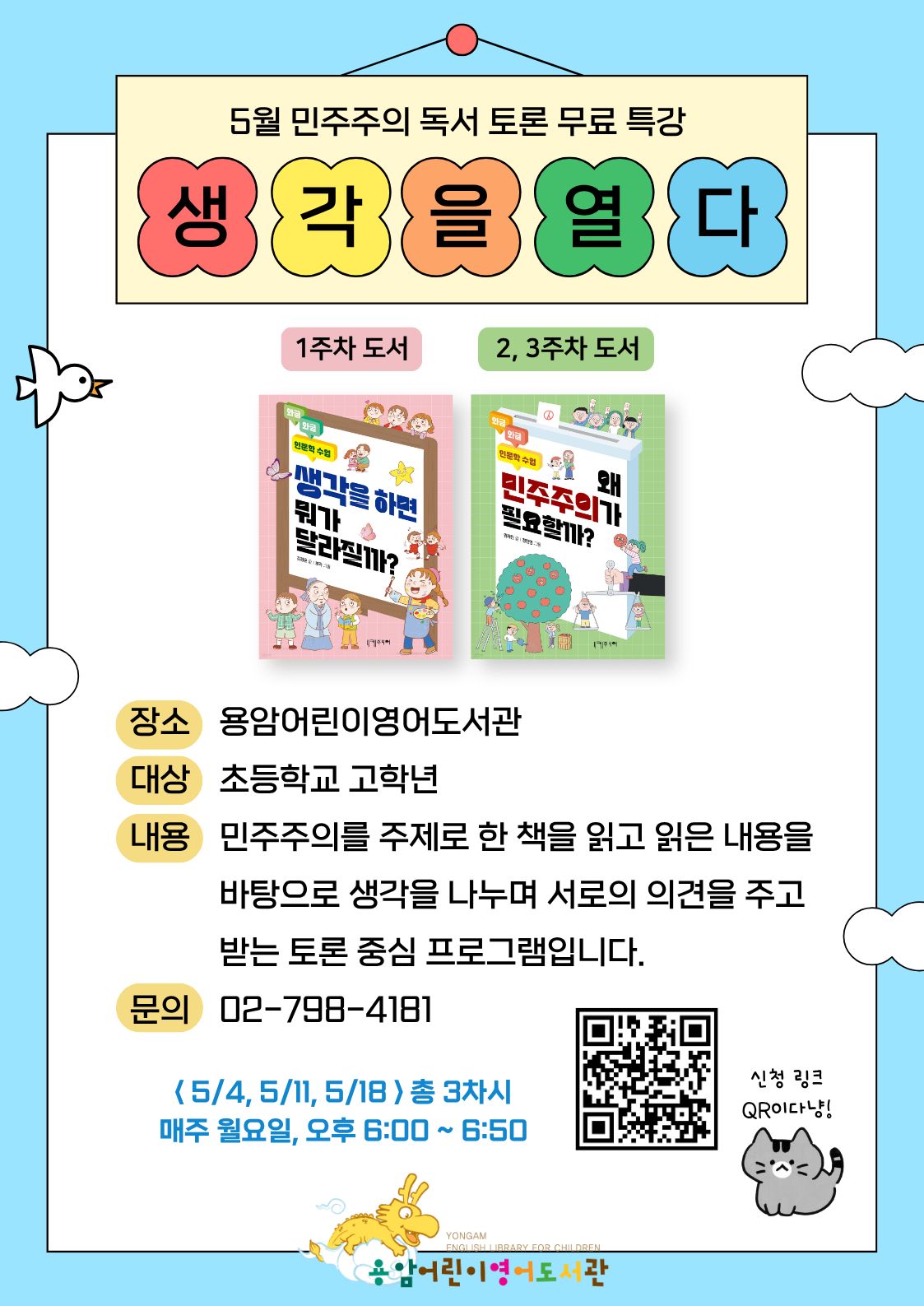 ![]() 📚 생각을 열다 – 5월 독서 토론 프로그램 안내 초등 어린이들이 책을 통해 사회를 이해하고 자신의 생각을 표현하는 힘을 기를 수 있는 특별한 시간을 준비했습니다. 이번 프로그램은 초등 고학년 학생들이 민주주의와 개인·공동체의 관계를 쉽고 흥미롭게 이해할 수 있도록 구성되어 있으며 자연스럽게 사고력과 표현력을 키울 수 있도록 돕습니다. ■ 운영 내용