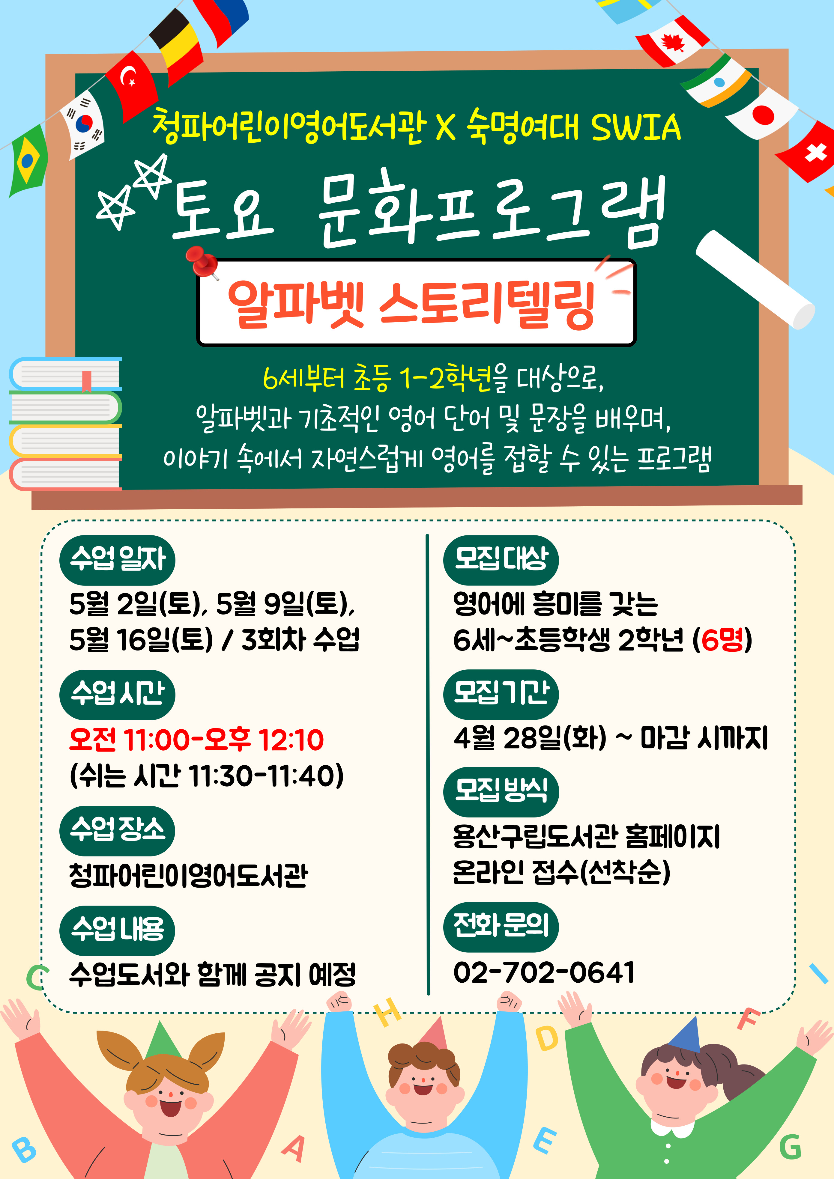 | 프로그램명 | 접수중 [토요 문화프로그램] SIWA 알파벳 스토리텔링 모집 (11:00-12:10) |
