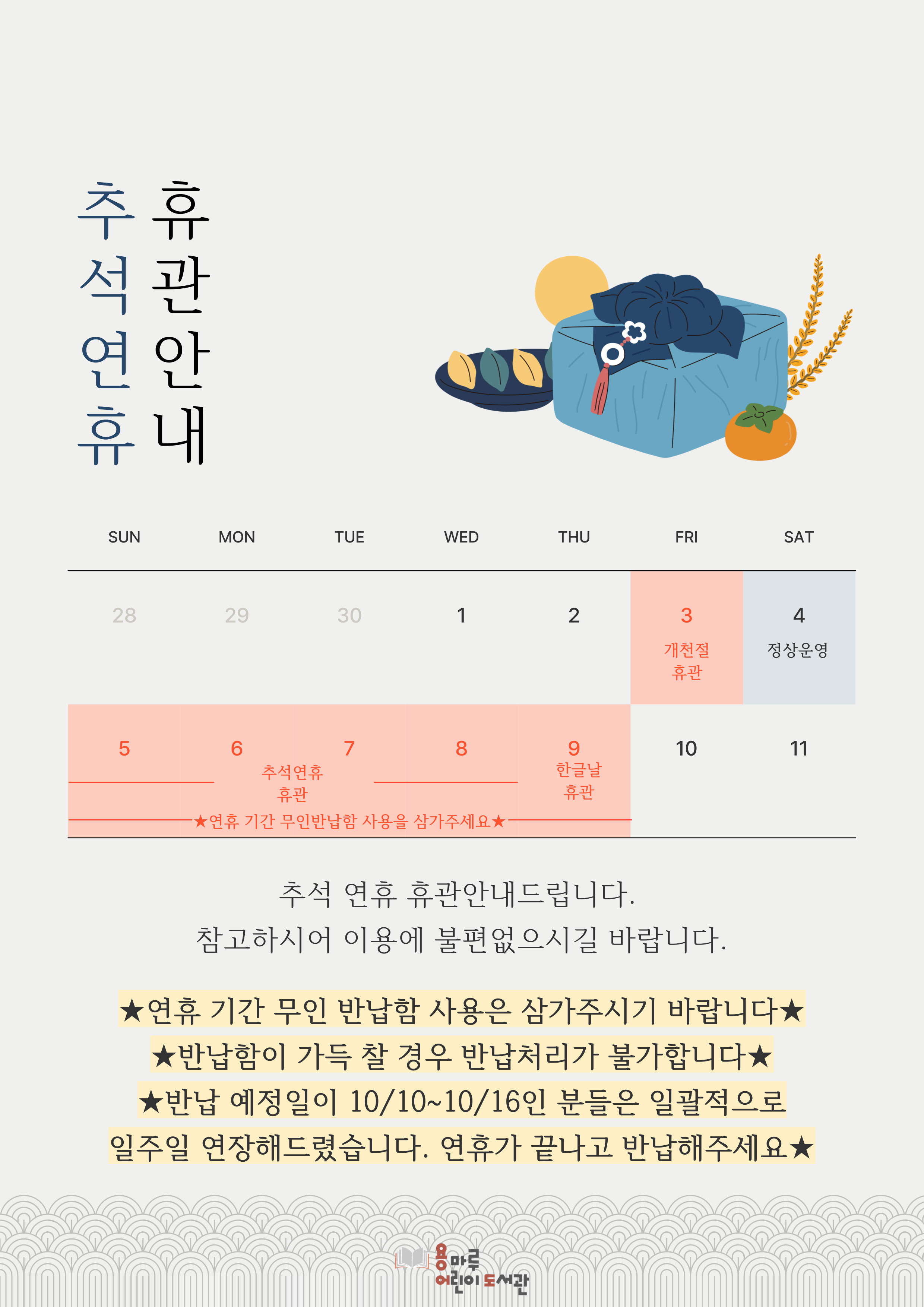 안녕하세요 용마루어린이도서관입니다. 연휴 기간 무인 반납함 사용은 삼가주시기 바랍니다! 반납함이 가득 찰 경우 반납처리가 불가합니다. 도서 반납 예정일이 10/10(금)~10/16(목)에 해당하는분들의 반납예정일을 일주일 자동 연장해드릴 예정이오니 도서 반납은 연휴가 끝나고 여유롭게 반납해주시기 바랍니다. 건강하고 따뜻한 추석 보내시길 바랍니다. 감사합니다. ![]() |