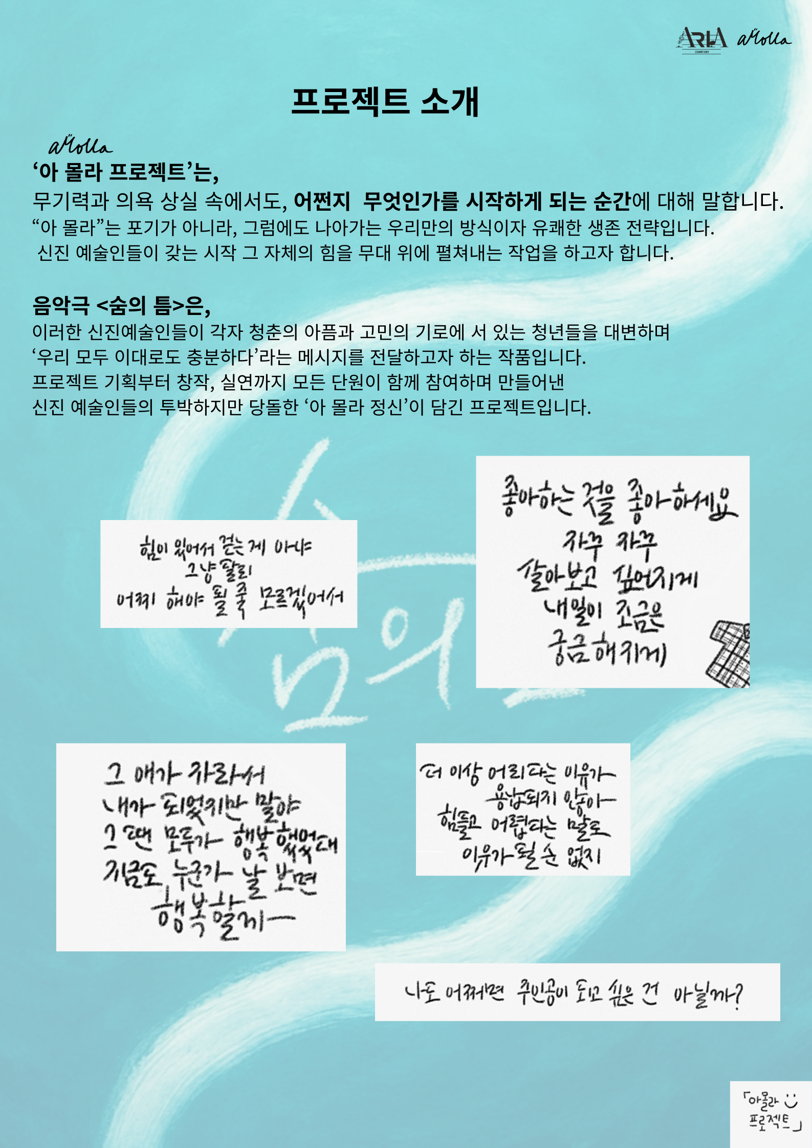 안녕하세요, 음악극 <숨의 틈>을 준비하고 있는 '아몰라 프로젝트'입니다.