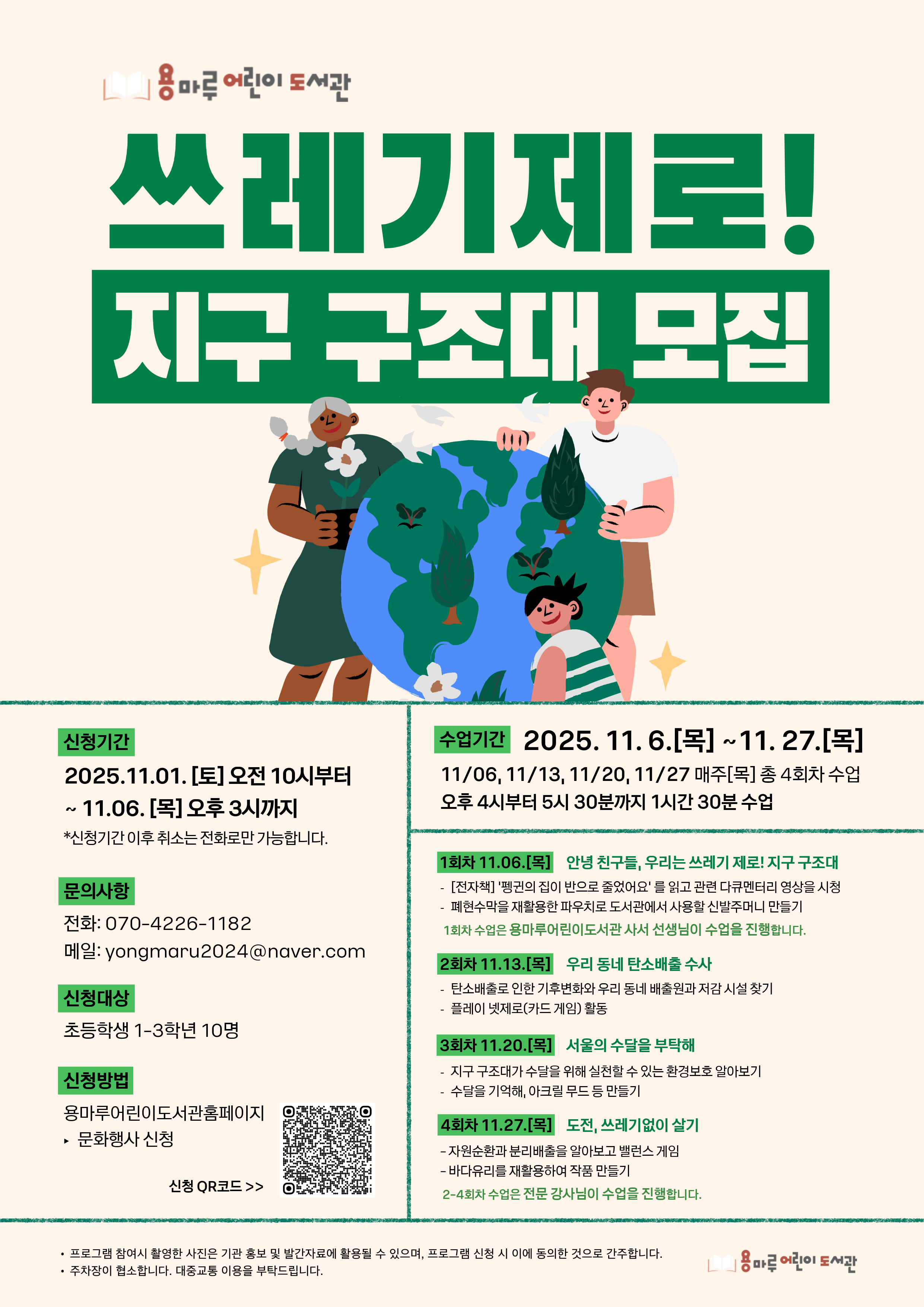 ★지구 구조대 모집★ 용마루어린이도서관에서 지구를 지키는 비밀 임무 우리 함께할래요?🚀 대상 초등학생 1-3학년 10명 신청기간 2025.11.01. [토] 오전 10시부터 ~ 11.06. [목] 오후 3시까지 *신청기간 이후로는 전화 취소만 가능합니다. 운영일시 11/06, 11/13, 11/20, 11/27 매주[목] 총 4회차 수업 오후 4시부터 5시 30분까지 1시간 30분 수업 - 참가자 정보에 꼭 ★어린이 이름★ 작성해주세요! (참가자 정보를 기준으로 수업전 이름표를 만들고있습니다~!) *운영직전에 취소하시면 다른 분들의 참여 기회도 제한됩니다. 신청완료 후에는 꼭 참여 부탁드립니다. ![]() |