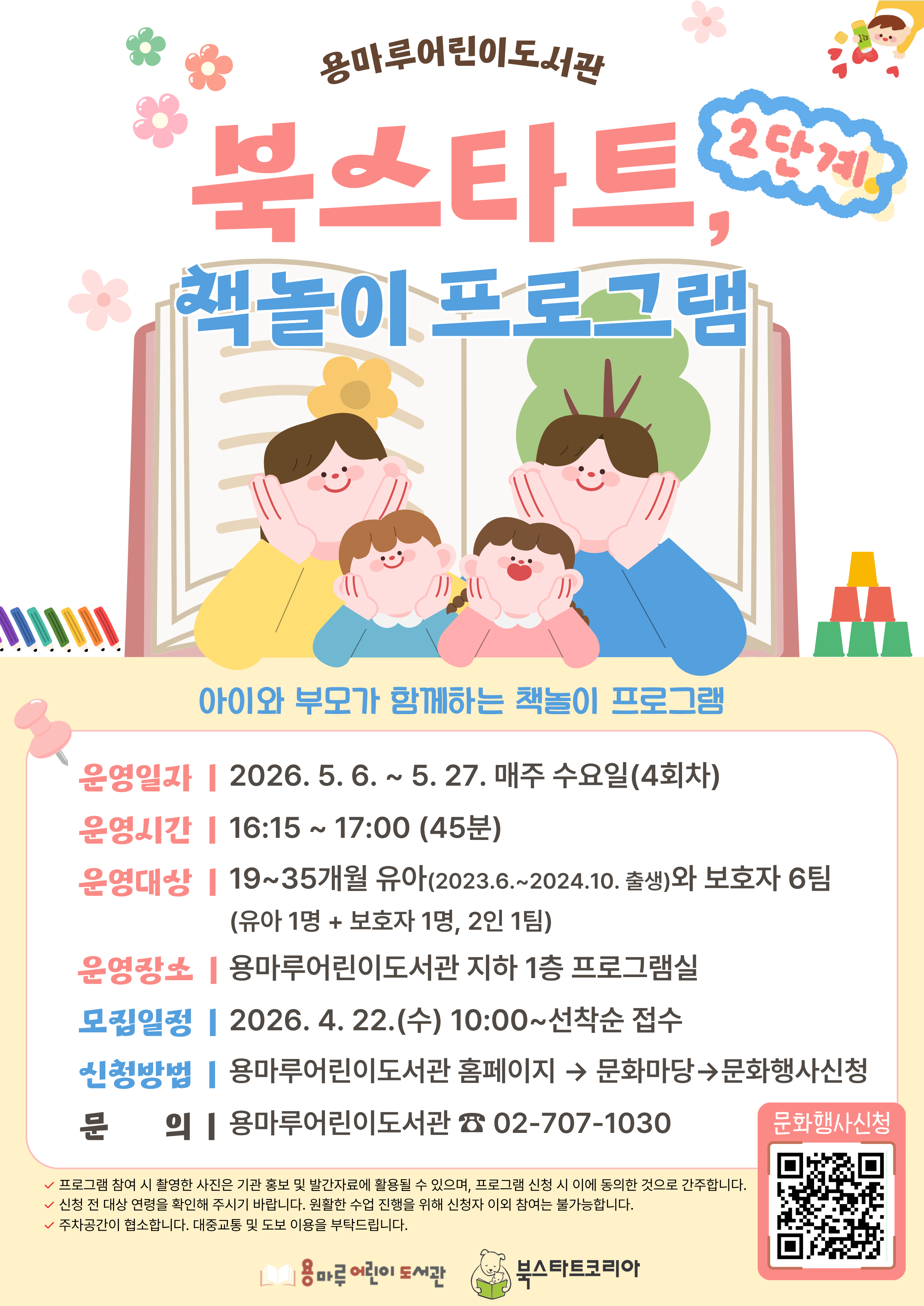 안녕하세요. 용마루어린이도서관입니다. 2026년 용마루어린이도서관 북스타트 책놀이 프로그램의 참여자를 모집합니다. ※ 해당 페이지는 북스타트 책놀이 프로그램 2단계(19~35개월) 참여자 모집 페이지 입니다. ※ 책놀이 프로그램 3단계(36개월~취학 전) 프로그램은 6월 진행 예정입니다. 추후 공지를 참고하여 주시기 바랍니다. 참여자 정보에 유아의 이름(개월수)을 입력해주세요! ex) 용마루(30개월) 북스타트 책놀이 프로그램은 유아 1인 + 보호자 1인 (2인 1팀)로 진행됩니다. ※ 1팀(유아 1인+보호자 1인) 1명으로 신청하시면 됩니다. ※ 쌍둥이 신청 시, 보호자 2명 동반이 가능 할 경우 2명의 아이디로 각각 신청부탁드립니다. 1명으로 신청하실 경우 1인분의 재료만 제공되는 점 양해부탁드립니다. ★원활한 수업 진행을 위해 신청자 이외 참여는 불가능합니다.★ 총 4회차로 진행되는 프로그램이니 모든 회차에 참여 가능하신 분만 신청부탁드립니다. 1회차 2026. 5. 6.(수) 16:15~17:00 2회차 2026. 5. 13.(수) 16:15~17:00 3회차 2026. 5. 20.(수) 16:15~17:00 4회차 2026. 5. 27.(수) 16:15~17:00