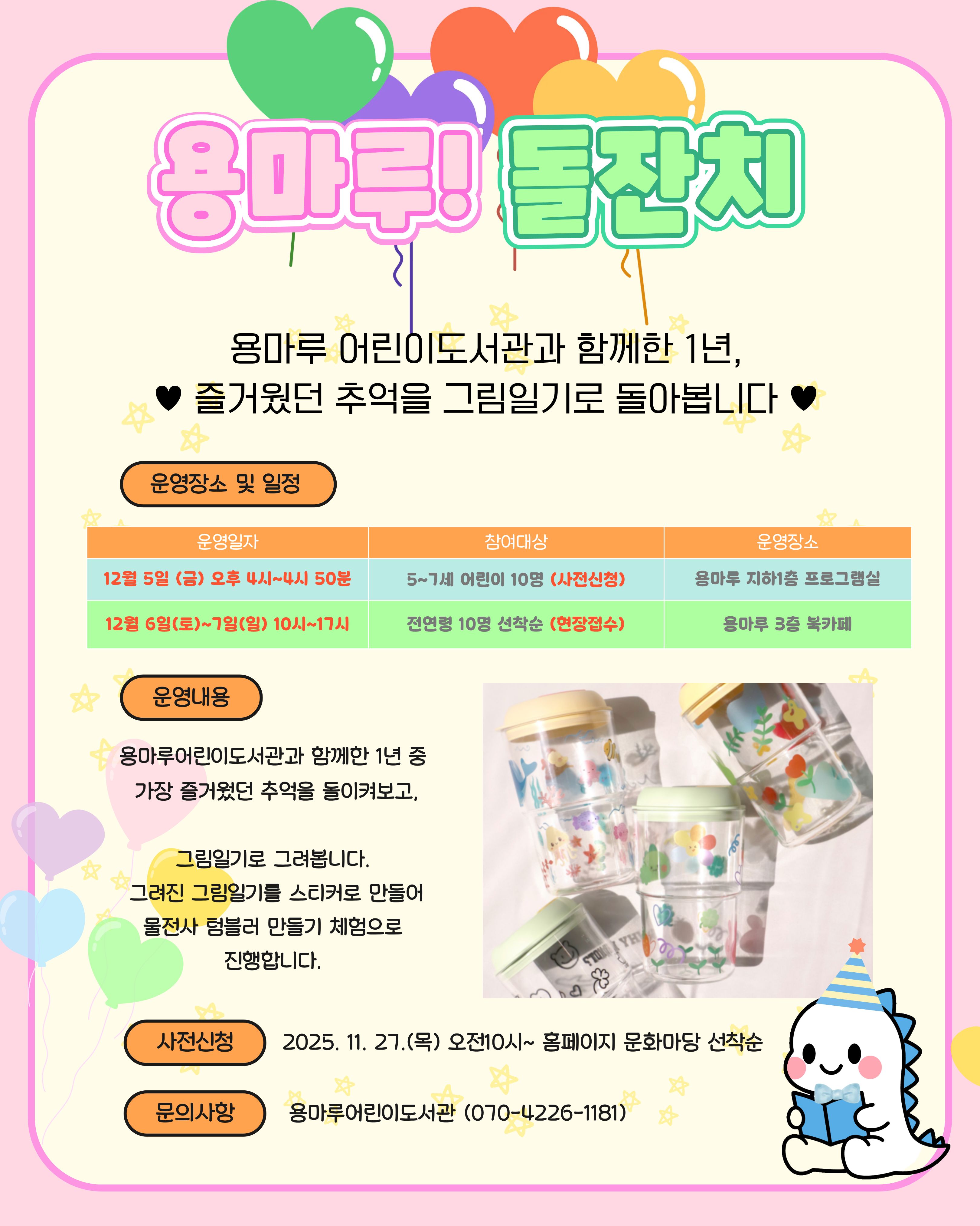 | 프로그램명 | 종료 용마루 돌잔치: 그림일기 물전사 텀블러 꾸미기 (12/5/금) 오후 16시~16시 50분, 5~7세 어린이 10명 |